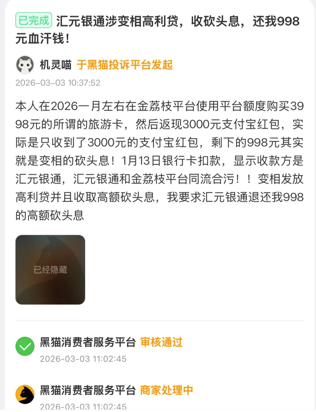 3月3日,有用戶在黑貓投訴:在金荔枝平臺使用額度購買398元旅游卡,號稱返現(xiàn)3000元支付寶紅包,實(shí)際只收到3000元紅包,剩下的998元被解釋為“權(quán)益費(fèi)”,扣款方顯示為匯元銀通。