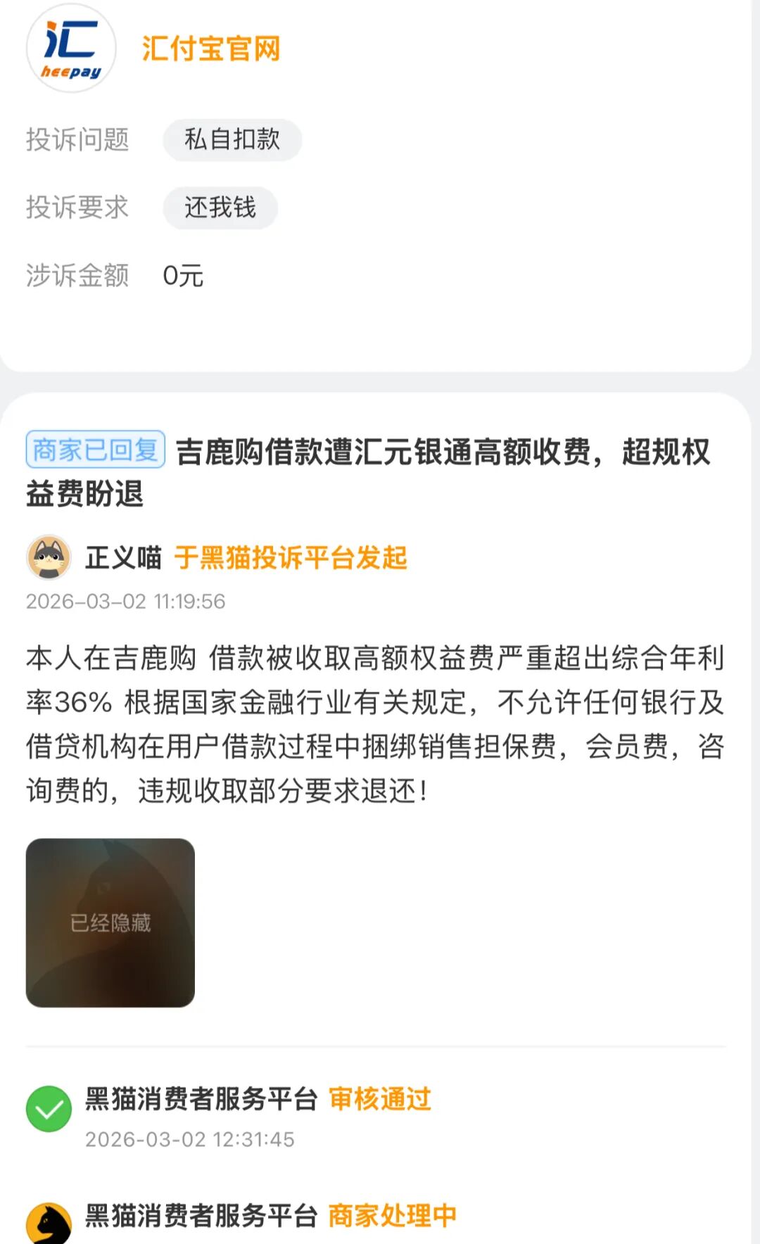 3月2日,有用戶在吉鹿購借款,被收取高額權(quán)益費(fèi),投訴稱“嚴(yán)重超出綜合年利率36%”,要求退費(fèi),收款方同樣是匯元銀通。