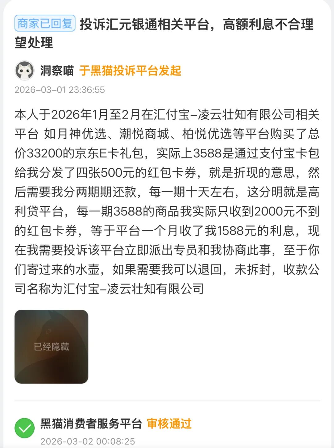 3月1日,有用戶在月神優(yōu)選、潮悅商城、柏悅優(yōu)選等平臺購買京東E卡禮包,總價33200元,實(shí)際只收到部分紅包卡券,被收取高達(dá)1588元的“利息”,收款方指向“匯付寶-凌云壯知有限公司”——而匯付寶,正是匯元銀通旗下的支付品牌。