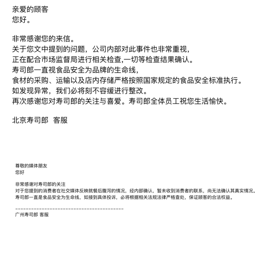 3月13日,廣州壽司郎客服郵件回應(yīng)稱,對(duì)于上述消費(fèi)者在社交媒體反映就餐后腹瀉的情況,經(jīng)內(nèi)部確認(rèn),暫未收到消費(fèi)者的聯(lián)系,尚無法確認(rèn)其真實(shí)情況。對(duì)方還表示,壽司郎一直視食品安全為生命線,如接到具體投訴,必將根據(jù)相關(guān)法規(guī)法律嚴(yán)格查處,保證顧客的合法權(quán)益。